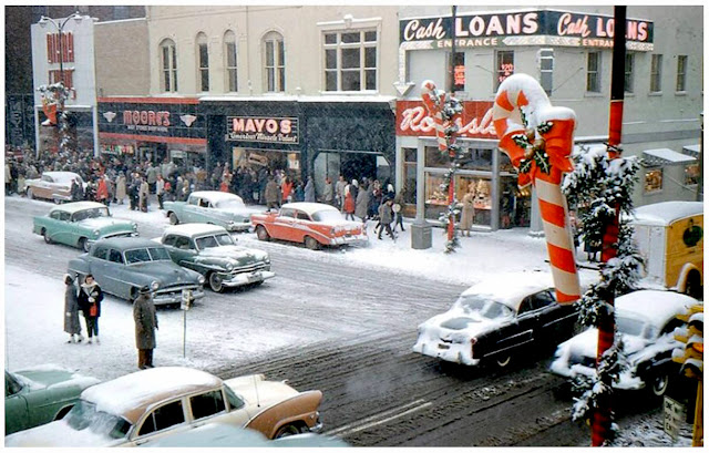 This first photo shows the front of the RO service station with worn signage, including a nice old Ford V8 sign, some beat up old gas pumps, a coke machine and one guy carrying an old fuel container and another guy changing the tire on Tom Dow's car, as well as a local Bourke's Drug Store sign on the side of the building which looks painted and aged. I tried to make everything look very busy.